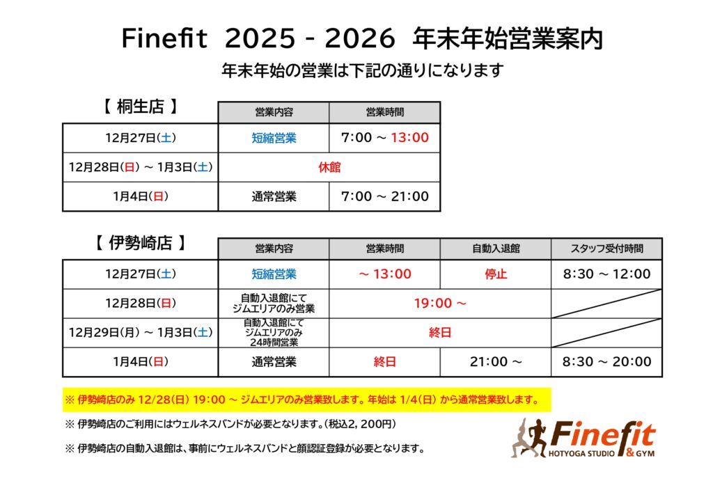 いつもFinefitをご利用頂きありがとうございます!\(^o^)/年末年始営業時間のお知らせです!不明な点ございましたら、スタッフまで確認お願いします!
